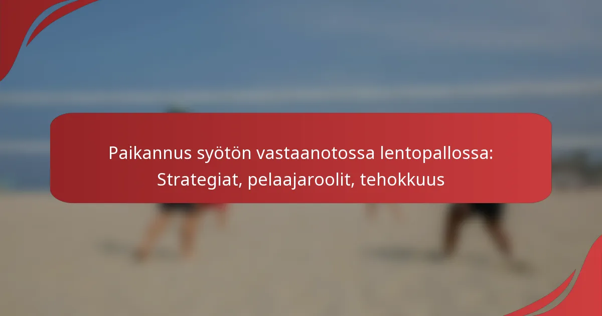 Tehokas syötön vastaanottamisen sijoittaminen lentopallossa sisältää erilaisten strategioiden ymmärtämisen, jotka parantavat joukkueen kykyä reagoida syöttöihin. Keskeisiä elementtejä ovat syöttötyyppien tunnistaminen, pelaajien vahvuuksien hyödyntäminen, joukkueen muodostelmien toteuttaminen, vastustajien analysointi ja selkeän viestinnän varmistaminen pelaajien kesken.