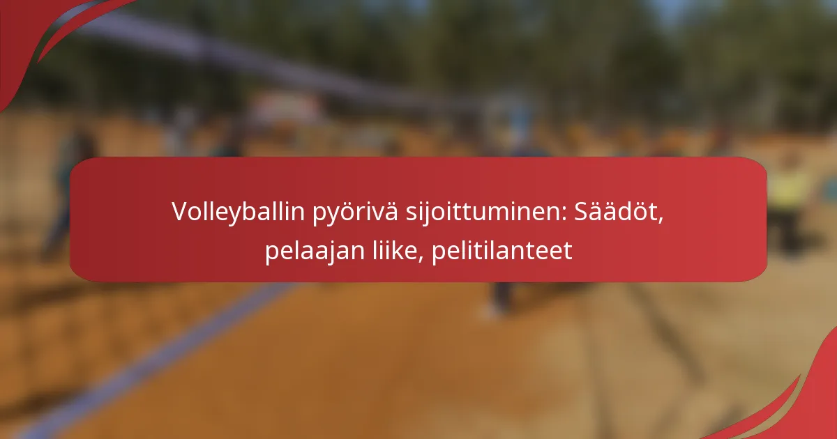 Volleynpyörityksen sijoittaminen on menetelmä, jolla pelaajat asettuvat kentälle ennalta määrätyssä järjestyksessä. Jokaisen pelaajan on käännyttävä kuuden paikan läpi, jotka vastaavat eturiviä ja takariviä, varmistaen, että kaikki pelaajat osallistuvat sekä hyökkäykseen että puolustukseen. Tämä järjestelmällinen lähestymistapa on ratkaisevan tärkeä joukkueen rakenteen ylläpitämiseksi ja suorituskyvyn maksimoimiseksi.